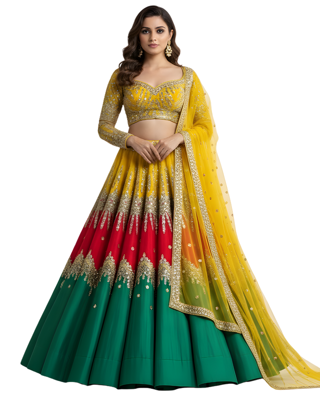 Vibrant, bold, and unapologetically graceful — this handcrafted bridal lehenga captures the essence of color and culture. Inspired by the brilliance of a macaw’s plumage, it features a sunlit yellow bodice, a soft red mid-panel, and a deep green skirt, all brought together through intricate embroidery and delicate sequin work.